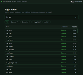 Searchable Tag Database Search tags right from the input field. Find tags you didn't know existed, see popularity counts, add them to your prompt. |