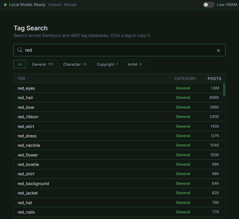 Tag Validation Every tag is checked against 111,000+ known tags. Valid tags show up green, unknown ones show red, so you can tell what works before you generate. |