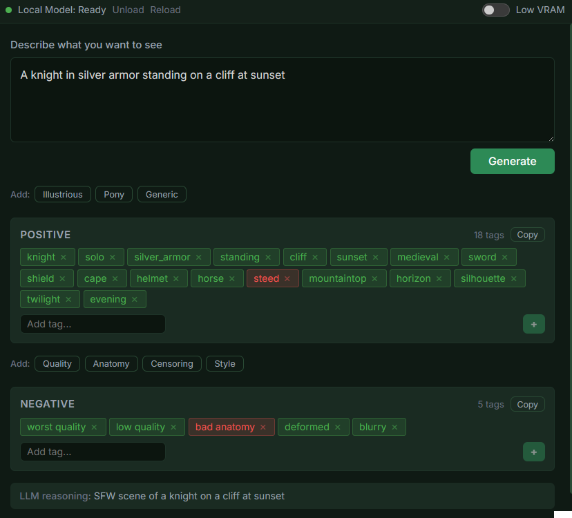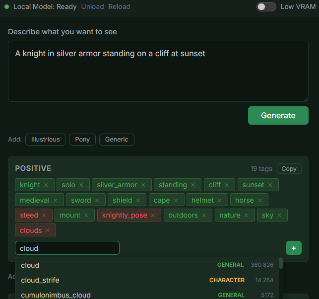 Natural Language Input Describe what you want to see in plain English. Something like "a knight in silver armor at sunset" and Sigil turns it into the tags SD needs. |